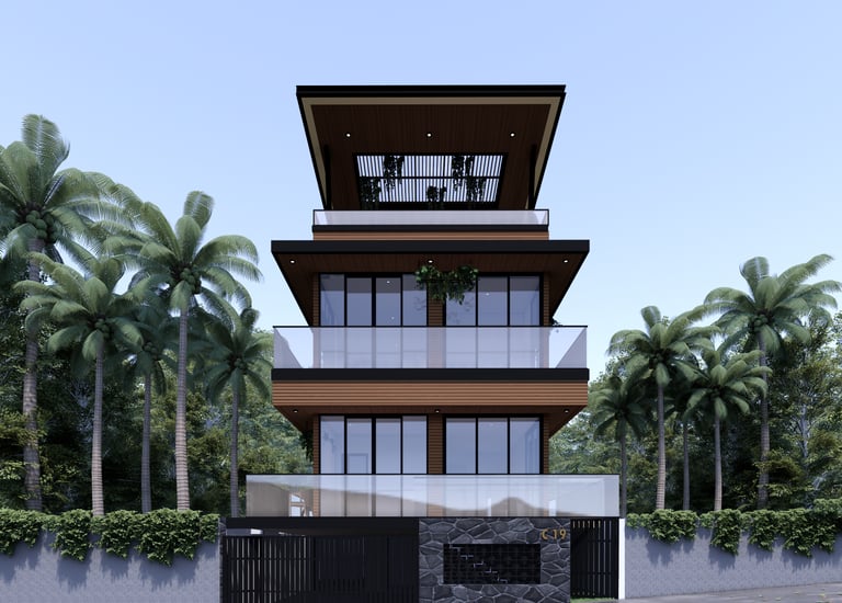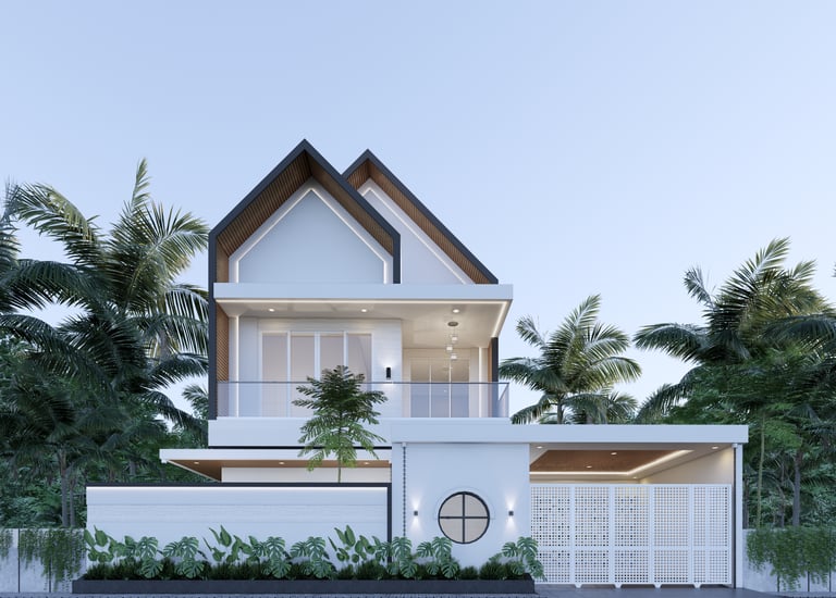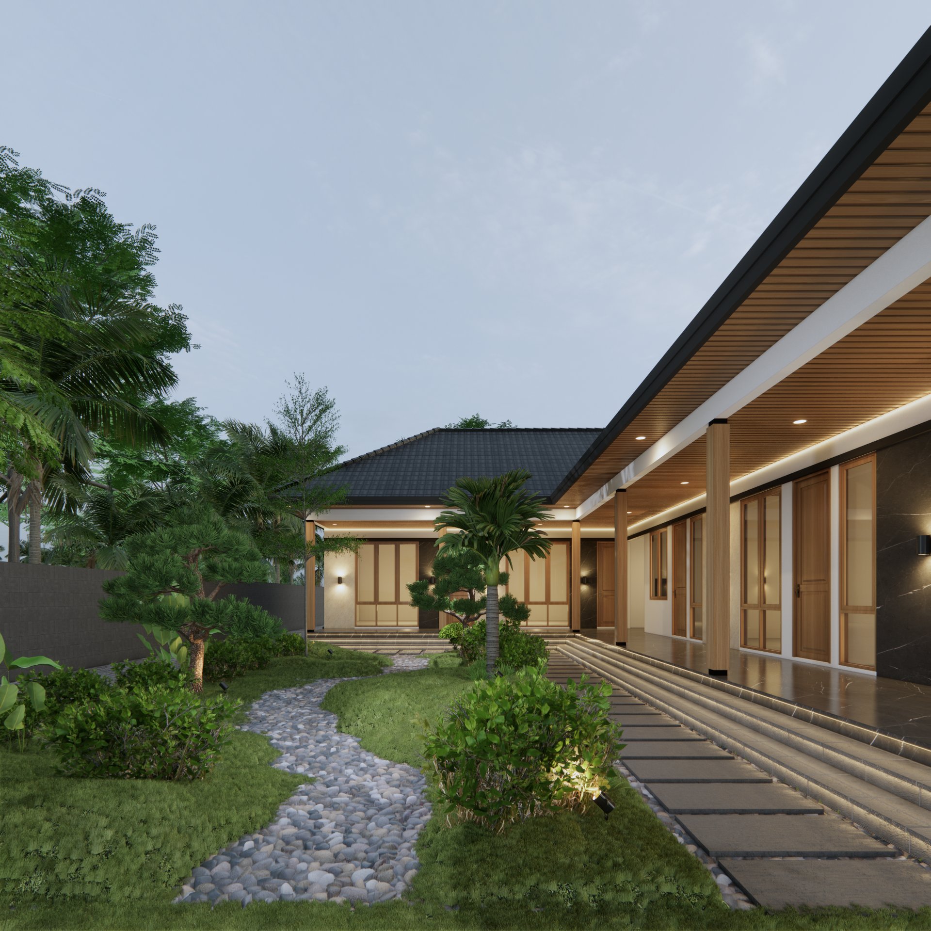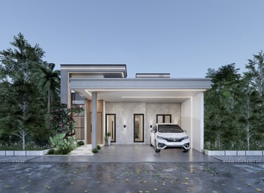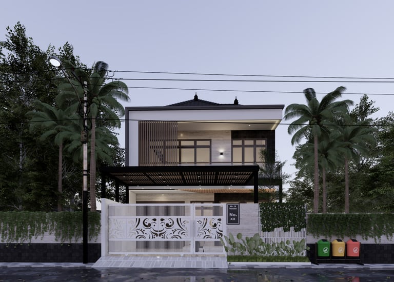 Desain rumah modern tropis yang mengutamakan pencahayaan dan ventilasi alami melalui bukaan lebar, overstek, serta secondary skin. Tata ruang dirancang adaptif terhadap iklim, menghadirkan hunian yang sejuk, nyaman, dan efisien energi.