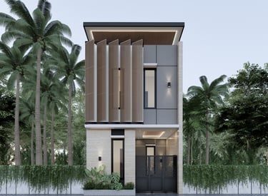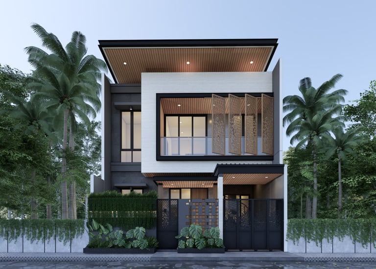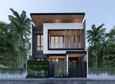 Desain rumah modern kontemporer dengan komposisi fasad yang tegas, permainan garis geometris, serta bukaan maksimal untuk pencahayaan alami. Mengutamakan fungsi ruang yang efisien dan tampilan elegan yang relevan dengan gaya hidup masa kini.
